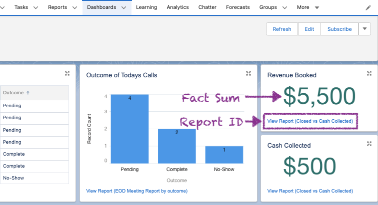ReportRunner00O# Streamscript to sum matrix report values $report = Call 'ReportRunner' '00O000000000123' {'0': 'TODAY'} $i = $report.reportMetadata.detailColumns.indexOf('Opportunity.Amount') $revenueBooked = Sum $report.factMap.get('0!T').rows $_.dataCells.get($i).value.amount Log `Revenue Booked: $revenueBooked`