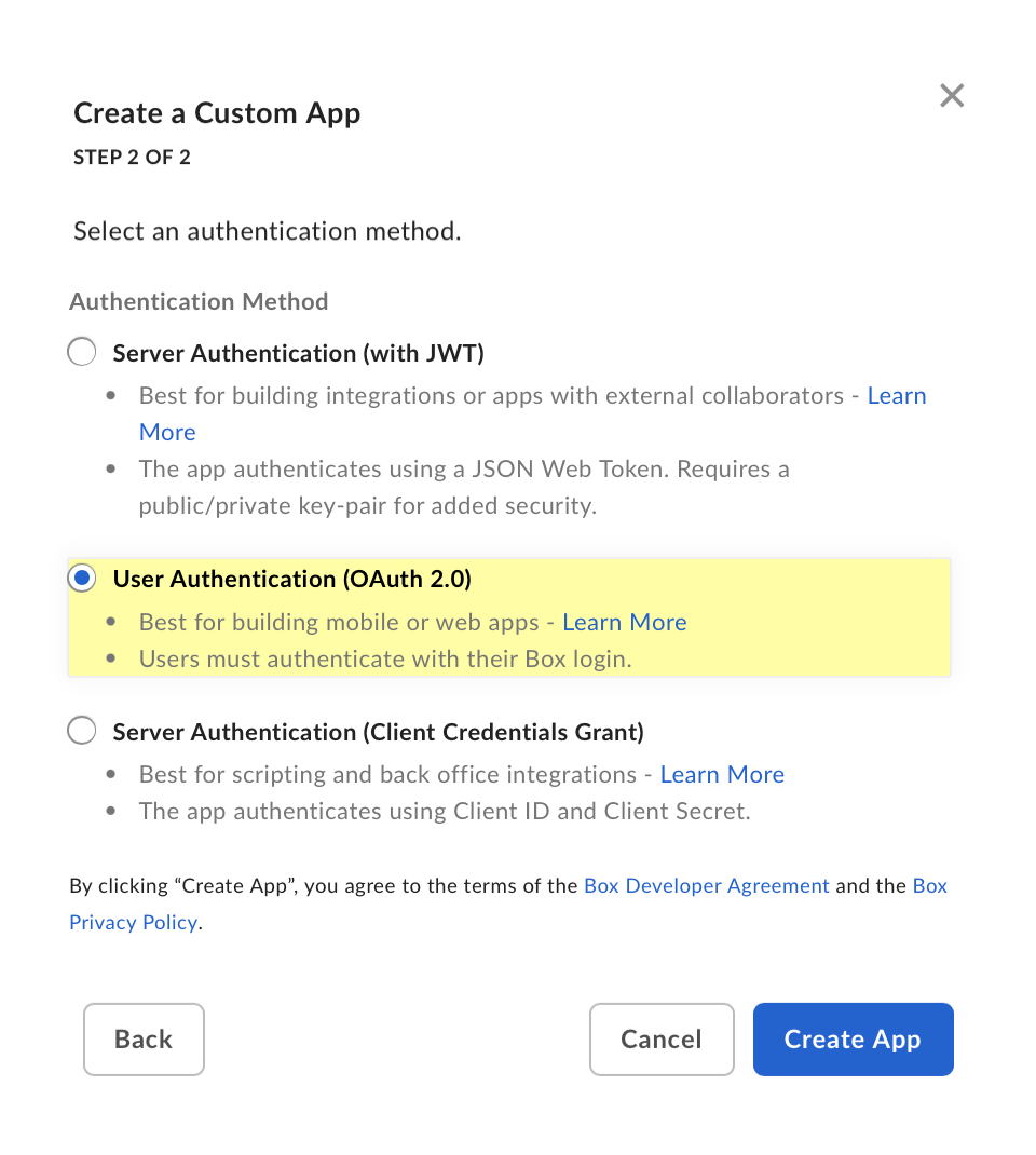 This option keeps the app private and does not require approval from Box.