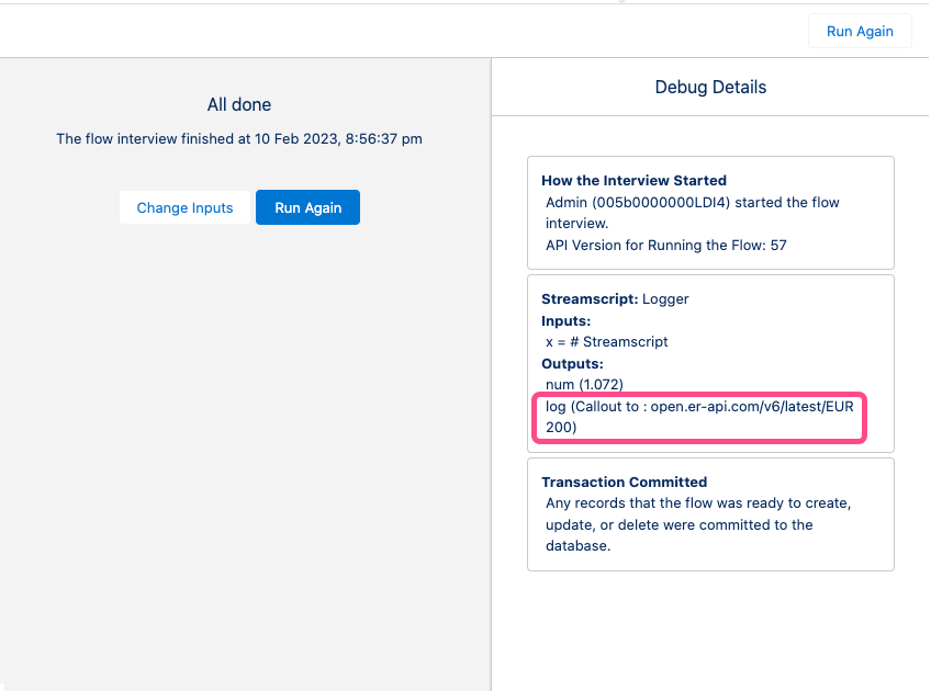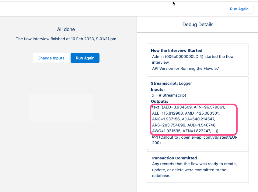When a script returns any value, it appears in the Debug Details. For example, this exchange rate logic may be modified to return the entire $result instead of just the USD rate: